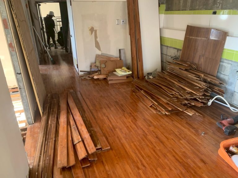 一見すると簡単そうに見える床張りも、実は「寸法係」「床材カット係」「施工係」といった専門の職人たちが、連携しながら手作業で進めていきます。